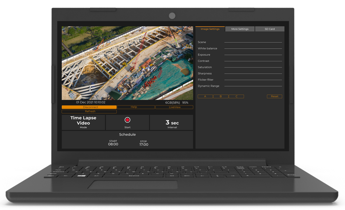 Accedi alla nostra piattaforma di comando e controllo all-in-one della videocamera, il Brinno Command Center (sistema operativo Windows a 64 bit). Visualizza l’anteprima dei fotogrammi della videocamera, cambia le impostazioni, controlla lo stato della batteria e della scheda SD e molto altro ancora!
